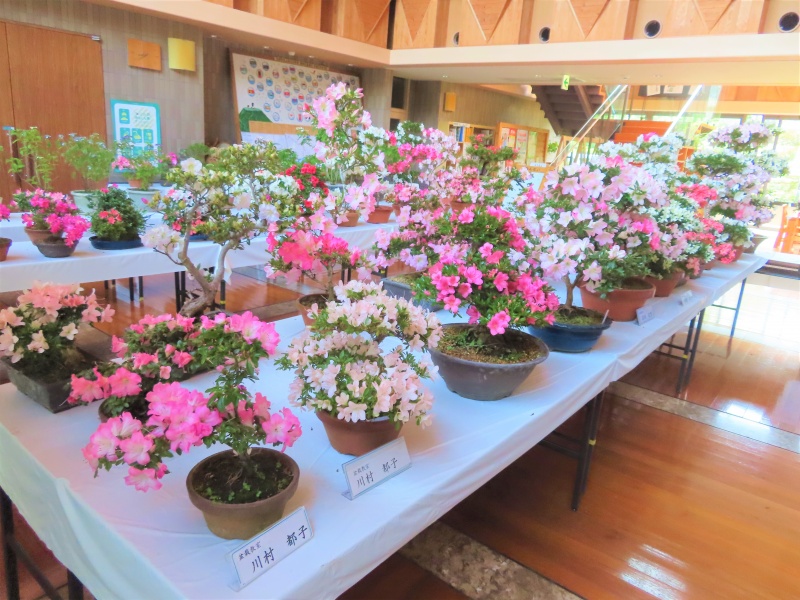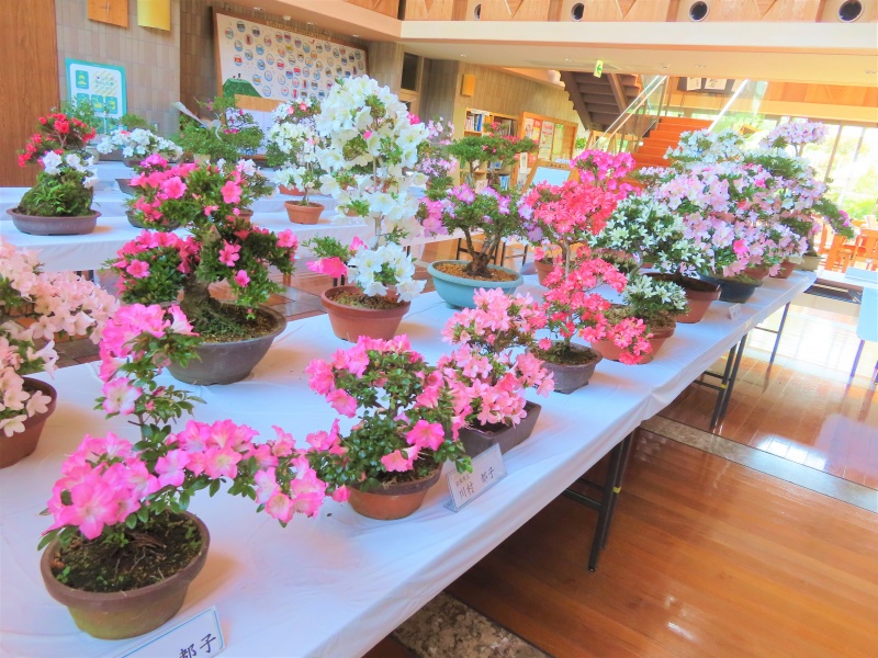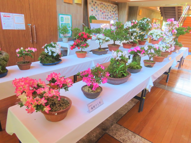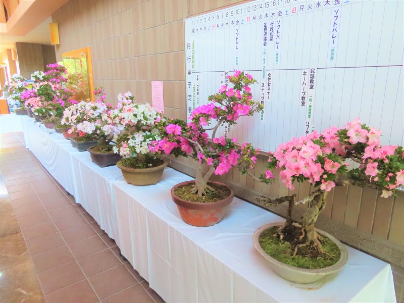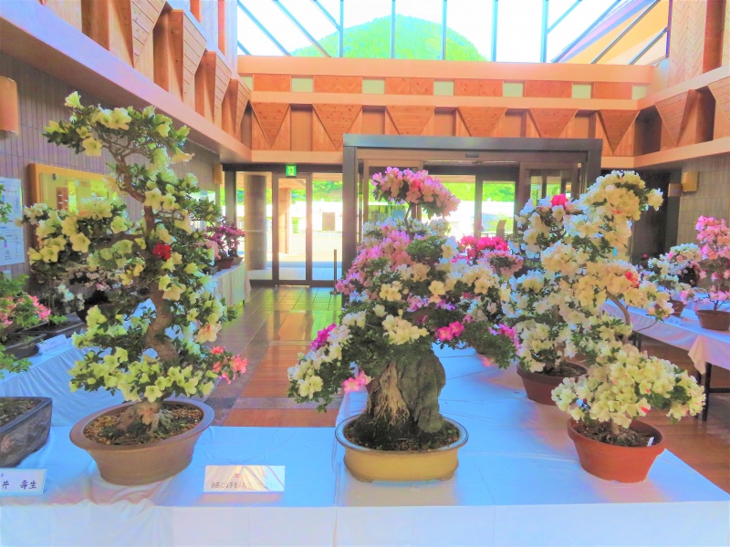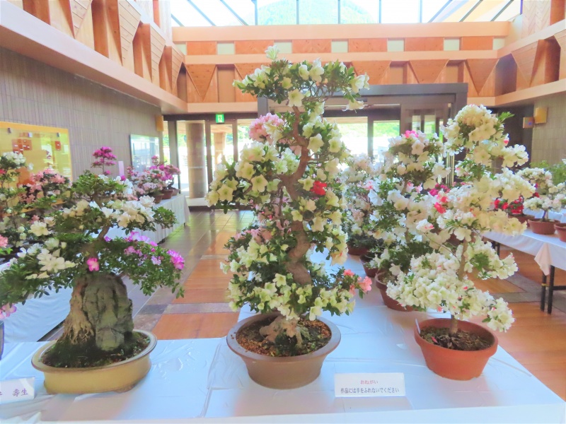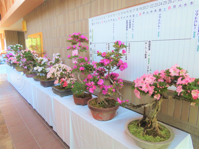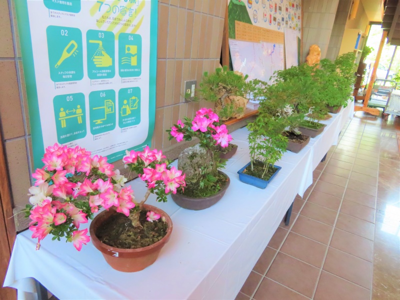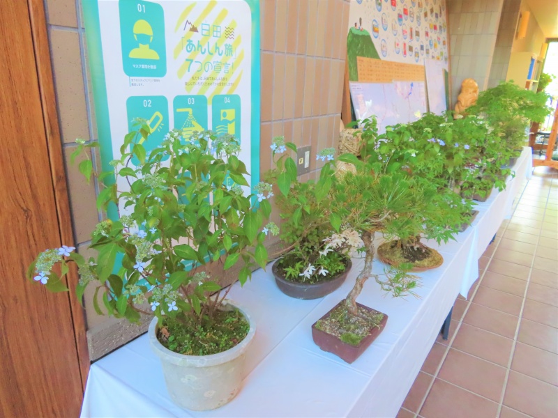 盆栽作品展は、平日の朝8時半から夕方5時まで、上津江振興局ロビーで開催中!
