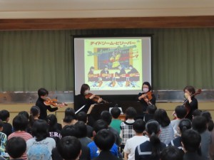 演奏会自体は津江朱中学校が企画。バイオリン(2人)、ビオラ、チェロ。3つの弦楽器を4人で演奏(カルテット)しました♬♫