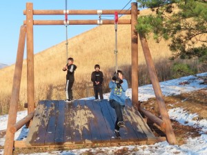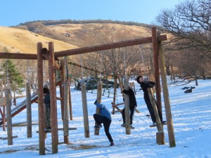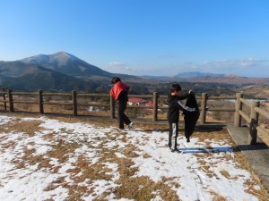 九重青少年の家に到着しました。施設の周りは数日前に降った雪がまだ積もっていました。
