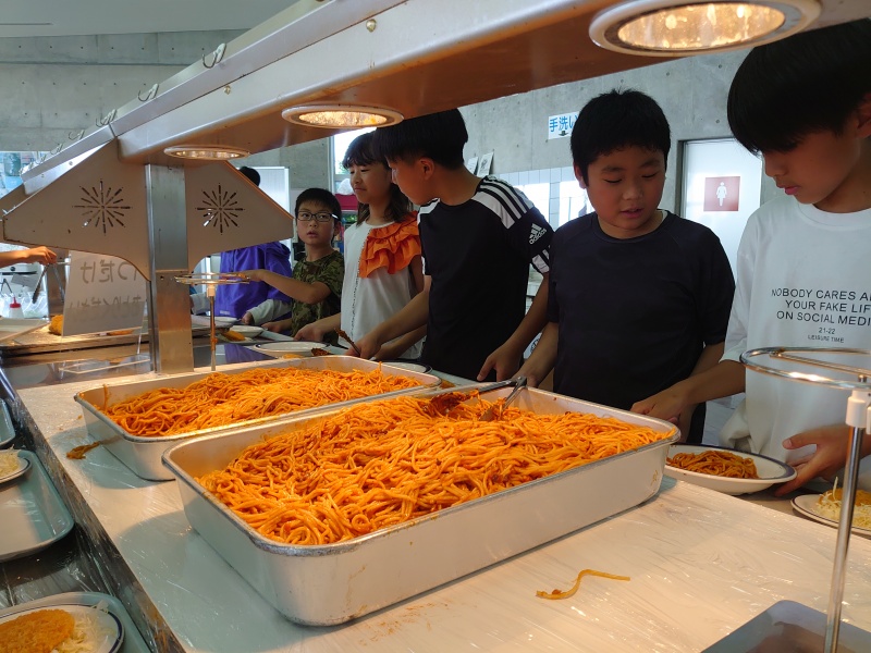 今日のお昼はスパゲッティ。自分で取り分けます。