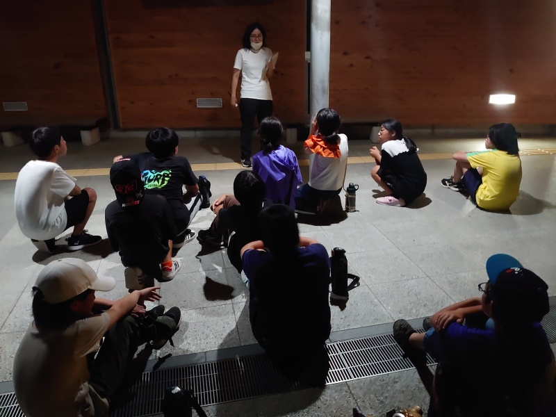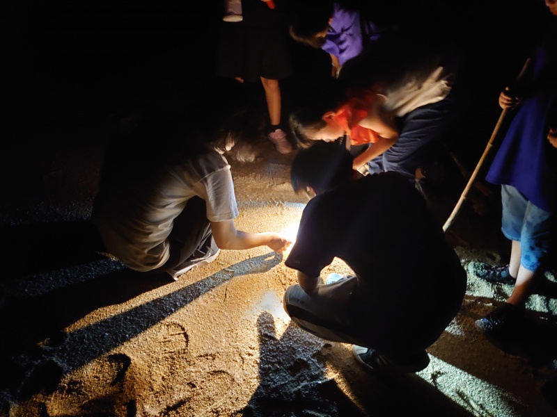 夜の活動は、海ほたる観察です。写真には撮れない小さな光でしたが、波打ち際で見ることができました。