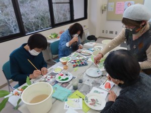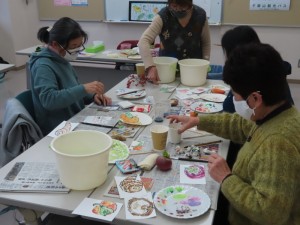 矢野シノブさんの指導で画仙紙や紙皿に季節の野菜や草木を描きました