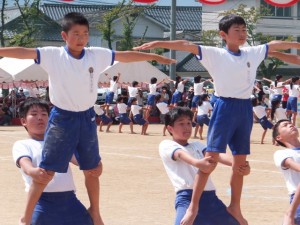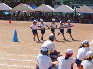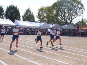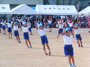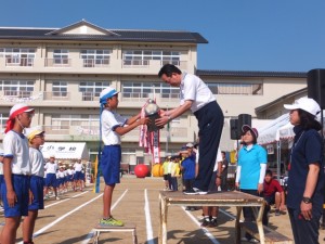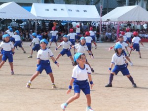 9月28日(日)、快晴の中、第36回咸宜小学校秋季運動会が開催されました。田代校長先生の挨拶の後、昨年の優勝チームより優勝旗・トロフィーの返還が行われました。その後、誓いの言葉の応援が青組・赤組・黄組から述べられました。「真剣勝負!最後まで協力しやりぬこう」を児童会スローガンに掲げ、子供たちは一生懸命真剣にそれぞれ競技に取り組みました。総合成績は 1位 黄組、2位 赤組、 3位 青組 でした。応援大賞は青組が勝ち取りました。