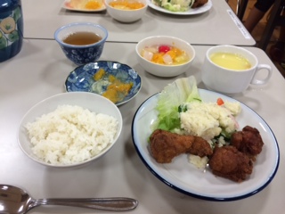 2日目夜のメニューは「唐揚げ」「ポテトサラダ」「フルーツポンチ」「コーンスープ」昨夜固まるのが間に合わなかった「ゼリー」