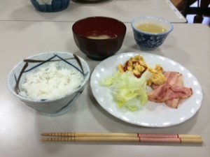 3日目の朝食メニューは、「ご飯」「豚汁」「ベーコン&スクランブルエッグ」です。