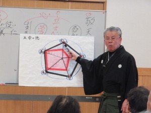 「敬天」(感謝する気持ち)と「立志」(夢や目標を持つこと)が大切であること、また五常の徳(仁・義・礼・智・信)のバランスがとれた人を目指しましょうとお話しされました。