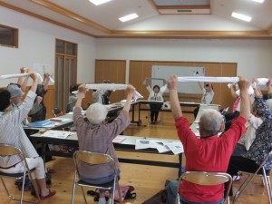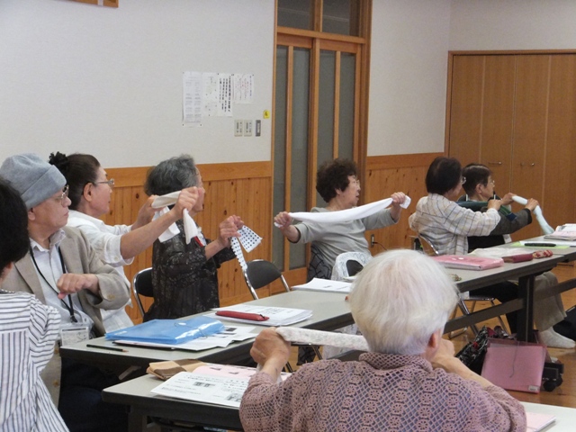 体操は、座ったままでもできる「タオル体操」で、身体をストレッチしてほぐします。