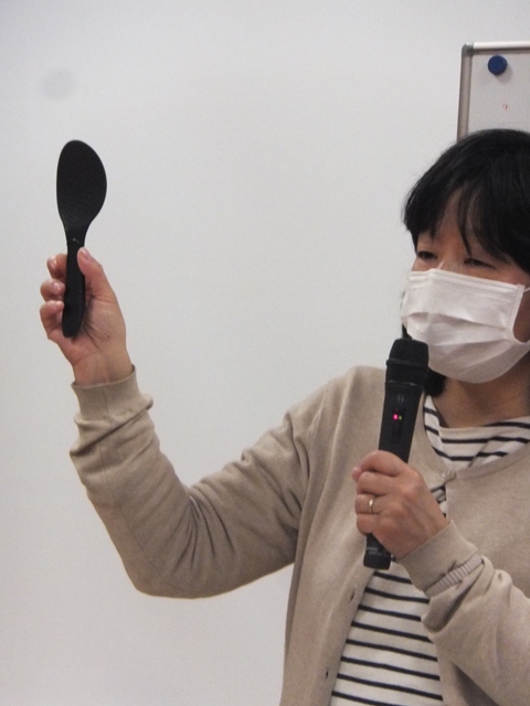 弱視の方も、白いごはんをどのくらいつげているか分かり易い黒いしゃもじ、同じく弱視の方にも使いやすい(特に学生さんなど)黒い定規。