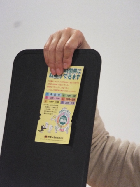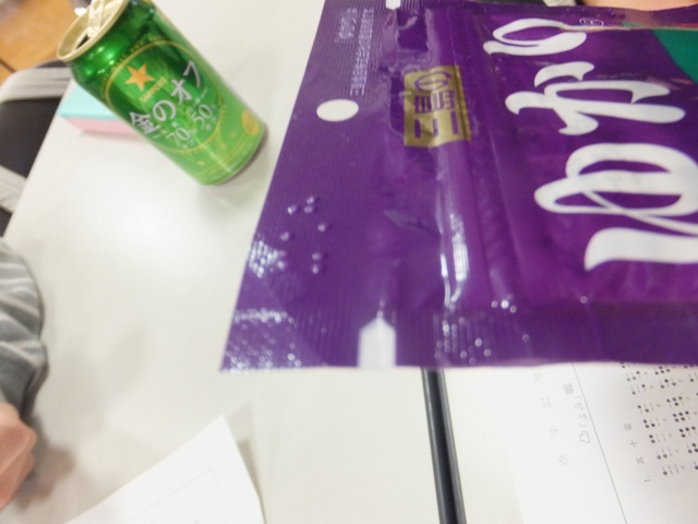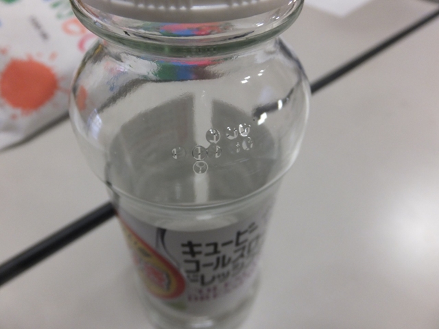 目の不自由な方でも、宅配物のお知らせが分かる不在票。食品容器に打ってある点字、何と書いてあるのか、点字表を見ながら当てていきました。これはドレッシングと書いてあります。
