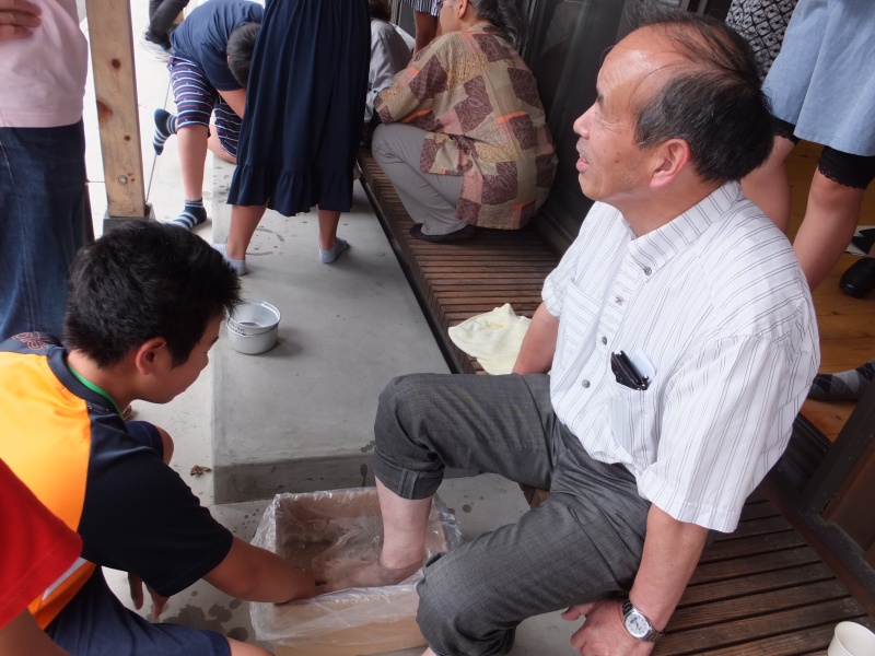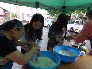 ダンボールとビニール袋でバケツを作り、炊き出しで沸いたお湯を使って足を洗ってあげる練習。