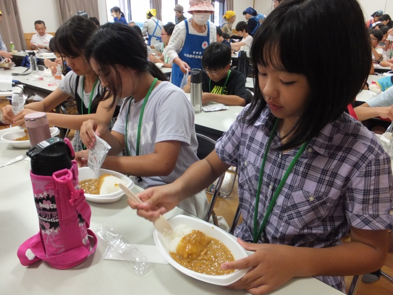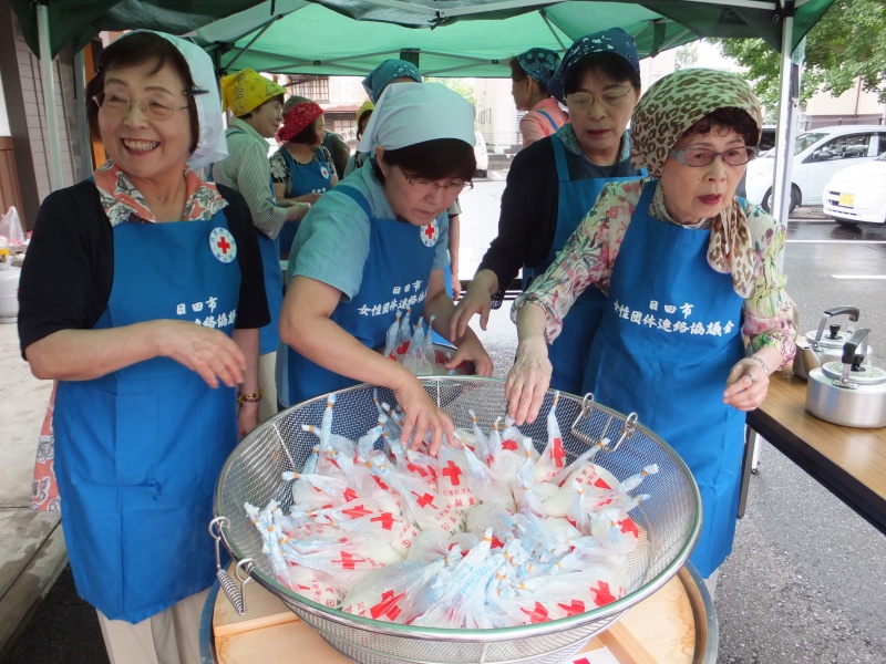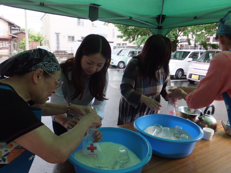 炊き出しの訓練。日田市赤十字奉仕団の梶原委員長(日田市女性団体連絡協議会会長)より、ハイゼックス(包装食袋)を使用した炊き出しの説明があり、参加者一人一人が練習しました。保護者も練習しました。日田市赤十字奉仕団員が大鍋で炊いてくださいました。ハイゼックス袋にお米と少量の水を入れています。