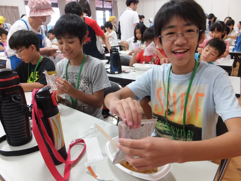 今回は、炊いたご飯にレトルトカレーをかけていただきました。栄養バランスを考えて、野菜ジュース付きです。