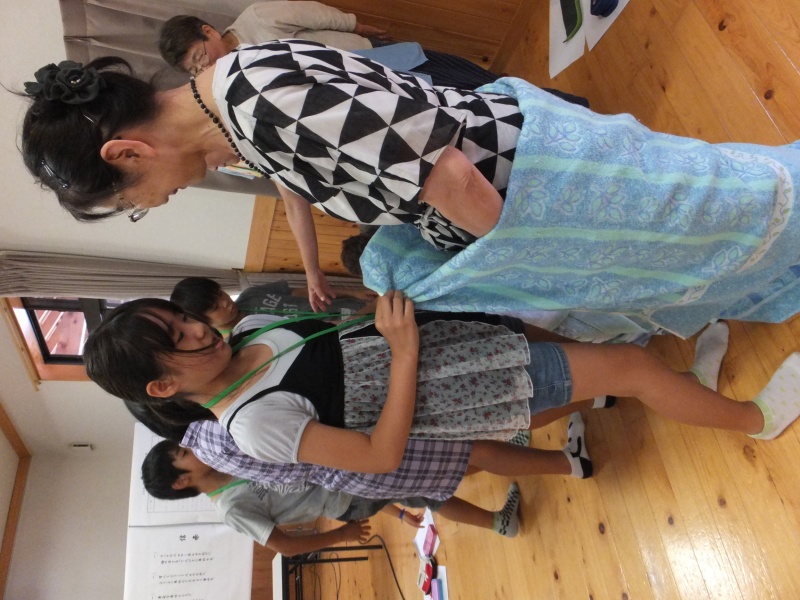 避難所が寒い時、タオルケットや毛布を使って、動いて回ることのできるガウンを作る練習をしました。