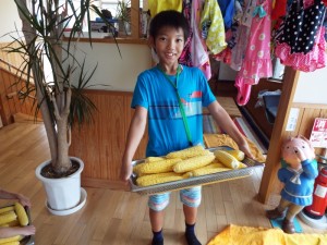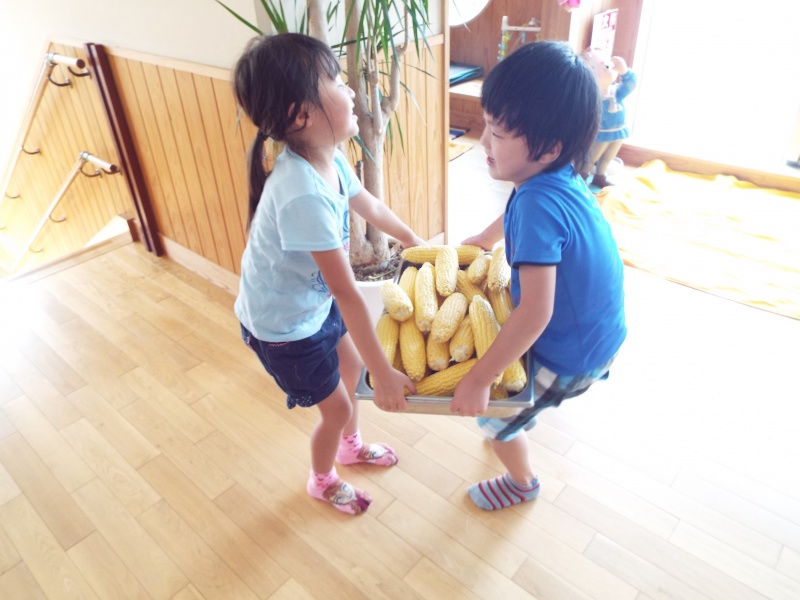 4歳児は、3時のおやつの「とうもろこし」の皮むきをしました!美味しそうです!