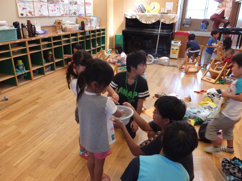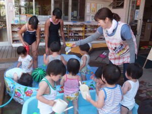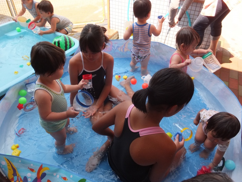 1歳児は水遊び、気温38度の日でしたので気持ちよさそうでした。