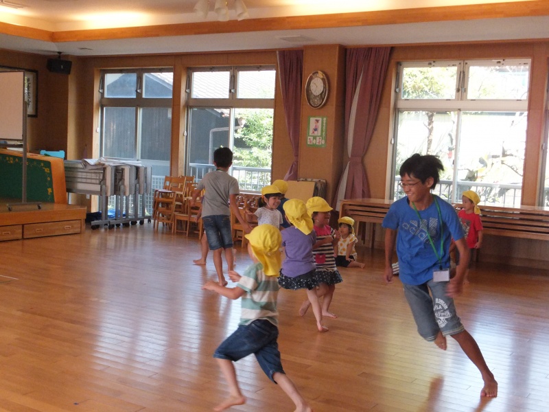 4歳児は、運動会の練習です!まずはつかまえオニ。6年生のお兄さん2名がオニになって追っかけます。幼児は大喜び!
