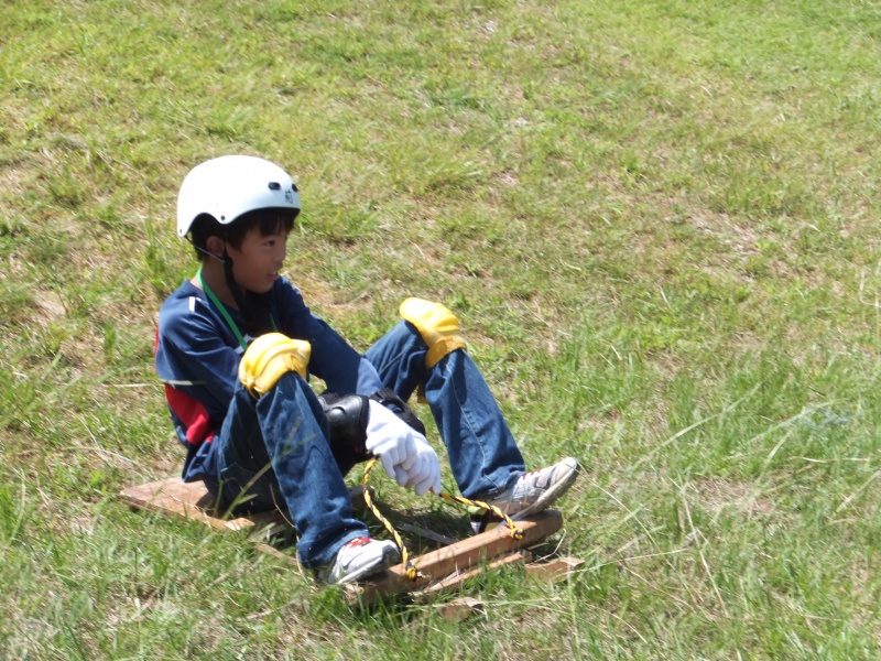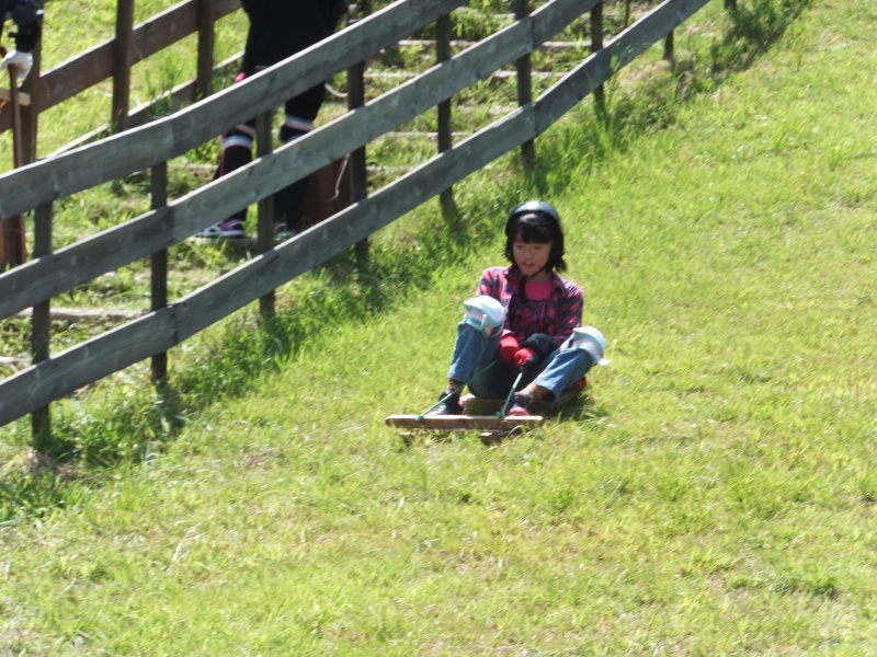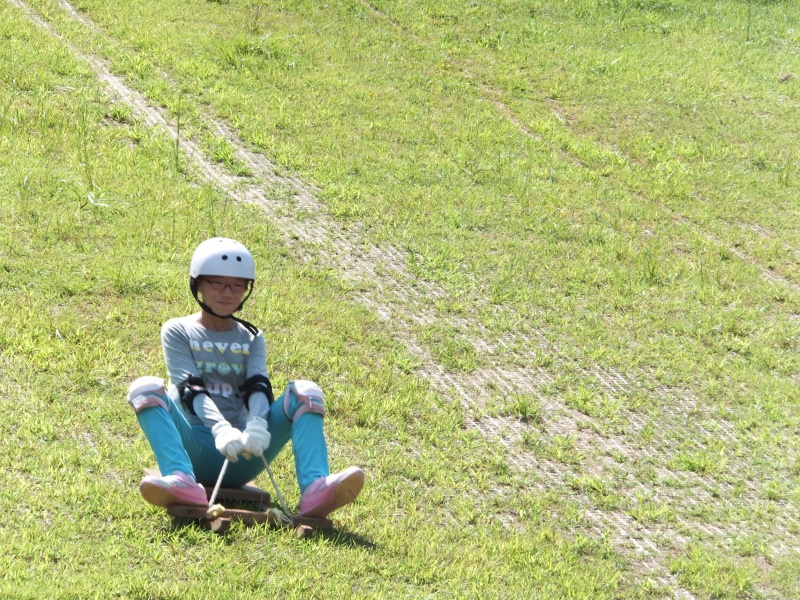草滑りはバランス感覚が大切。途中でバランスを崩して倒れる子もいましたが、滑るたびに上達していきました。