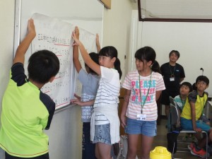午後からは、キャンプの振り返り。キャンプのはじめにたてた班の目標が達成できたか、班で話し合い発表しました。