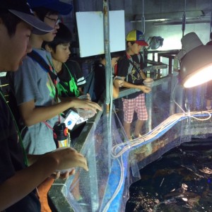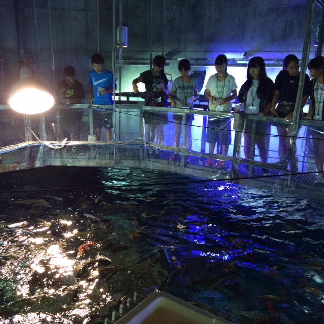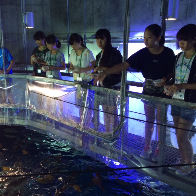 日ごろは飼育員しか入ることのできないバックヤードを見学し、魚の餌やりを体験しました。