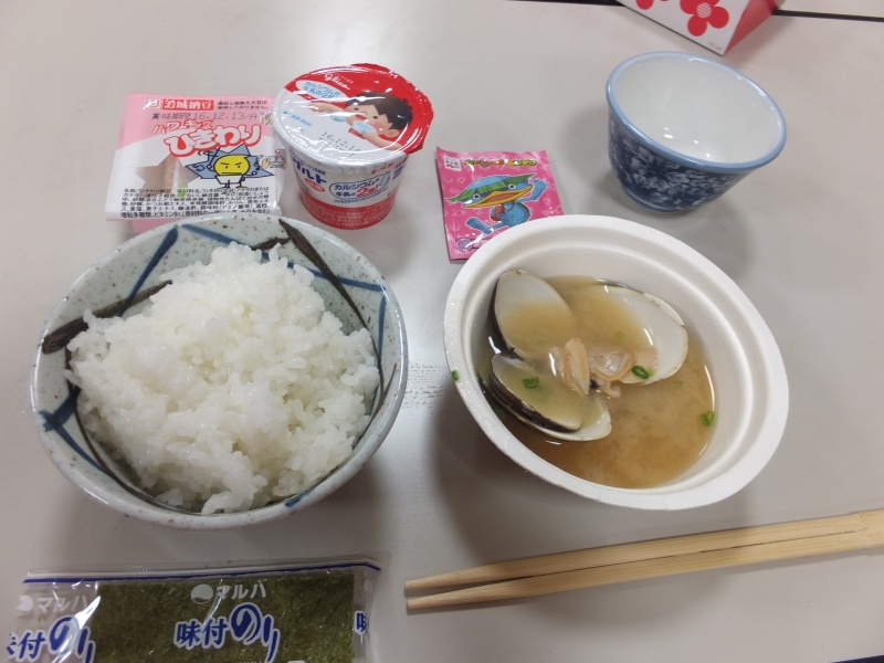3日目の朝。ごはん、はまぐりの味噌汁、納豆、ウインナー、のり、ヨーグルト、オレンジジュース。