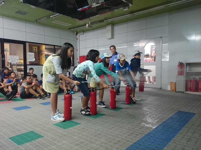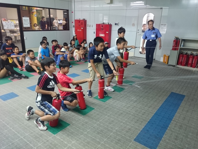 防災センターで最後の体験活動、消火訓練です。消火器を使って、モニターに写っている火災を消火する練習です❗