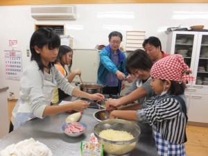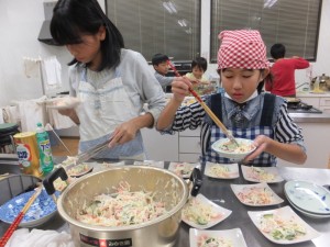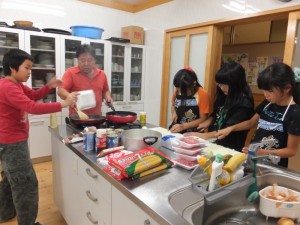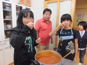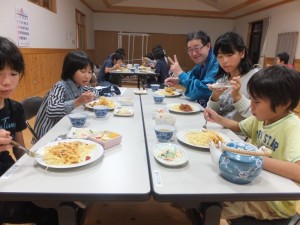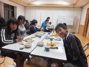 夕食当番班のチームワークの良さで、1時間ほどで料理が完成しました。皆でいただきます。