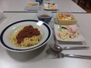 夕食メニューは「ミートスパゲティー」「マカロニサラダ」「フルーツポンチ」