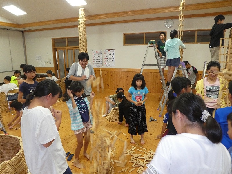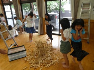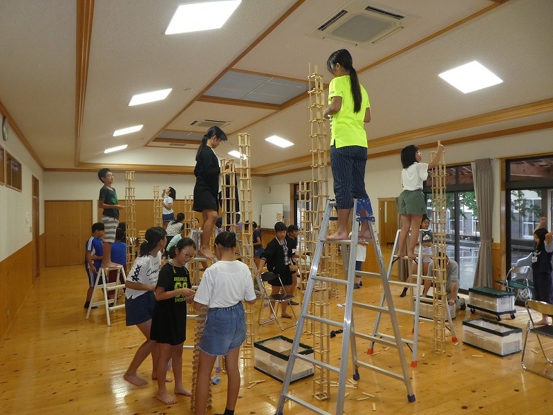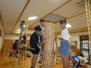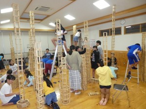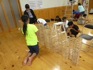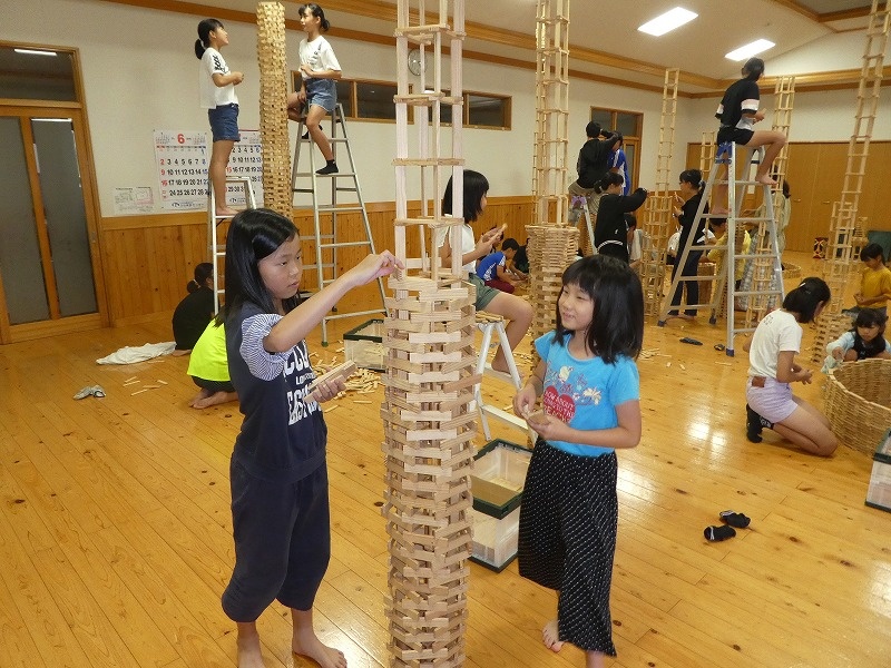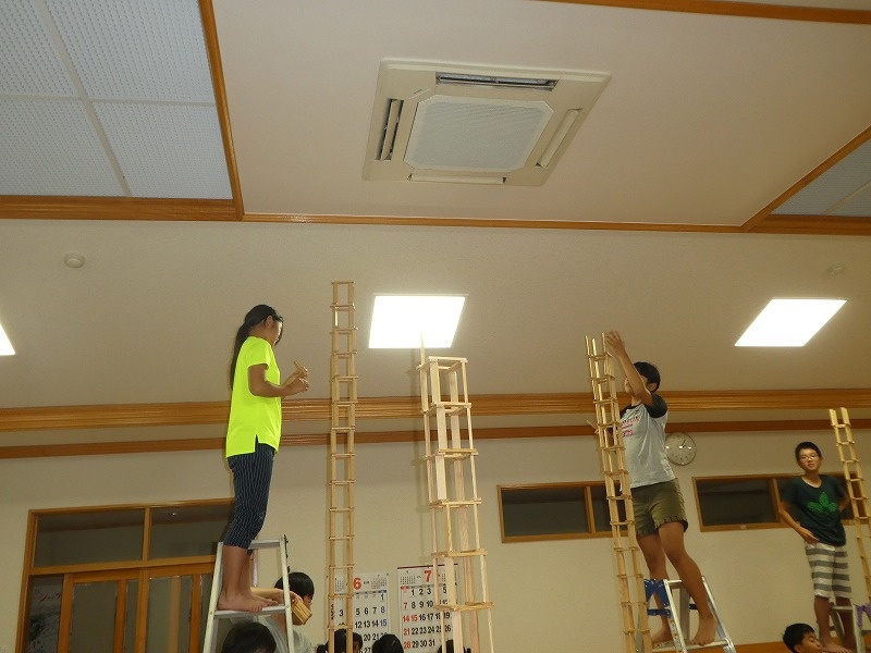 何人もの子ども達が、身長の2倍以上、天井に届くまで高く積み上げていました。