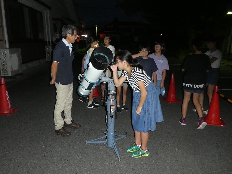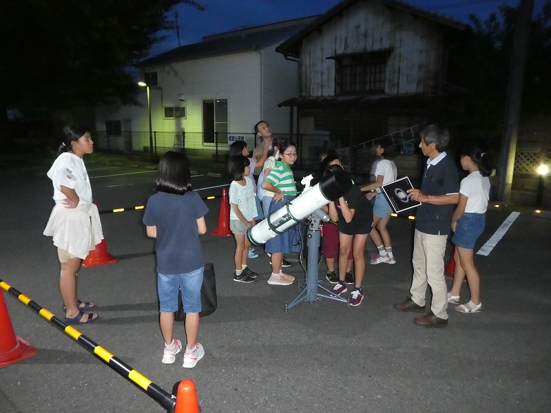 19時からの開始に合わせ、公民館に来た人から天体望遠鏡を覗いてもらいました。