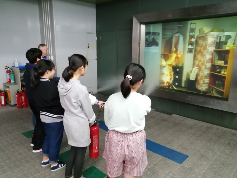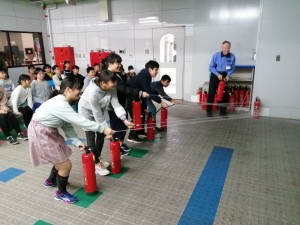 訓練用の消火器を使って、モニターの火災の消火に挑戦です!