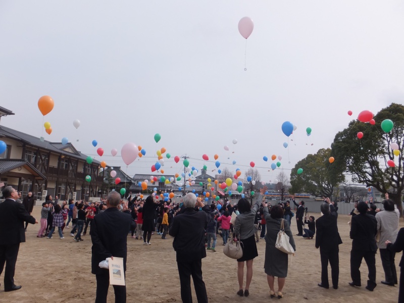 式典の後、グラウンドで1・2・3年生が「新しい校舎への思いを乗せて」風船を飛ばしました。