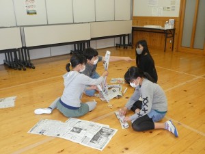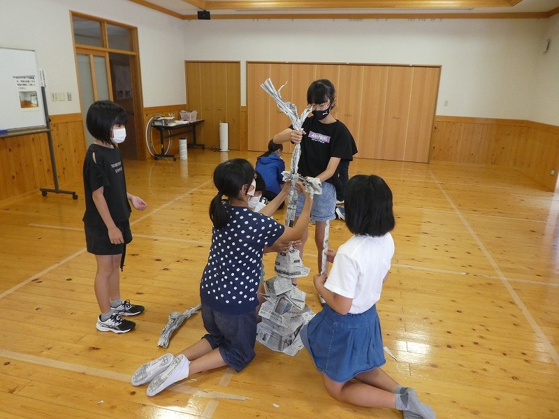新聞紙と決められた数のセロテープを使って、できるだけ高いタワー作りに挑戦。