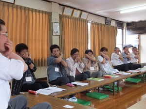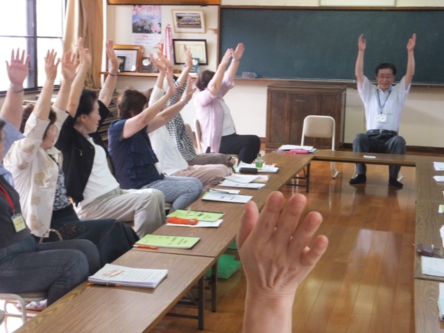 はじめに、指導員でもある自治会長よりご挨拶がありました。 次はレクレーションタイムで身体をほぐし、リラックス。