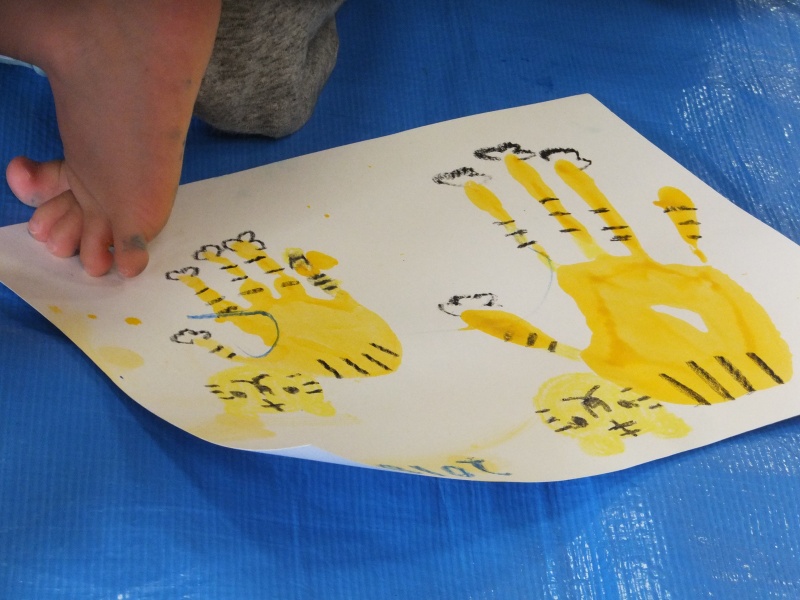 お母さん、幼児の手型をとり、それを動物に見立てます。可愛らしい寅の親子の完成!