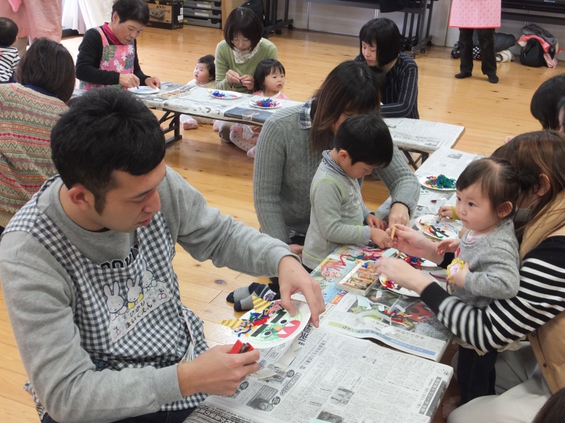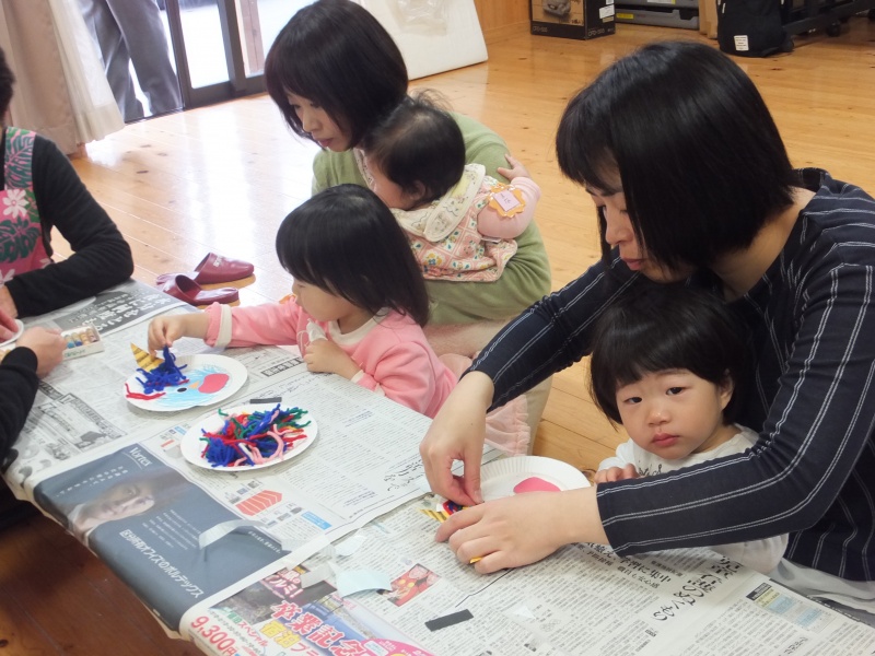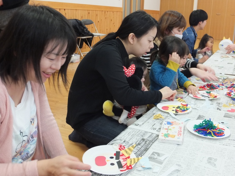 幼児は、お母さんと一緒に紙皿に毛糸を髪の毛に見立てて貼ったり、クレヨンで顔を書きました。