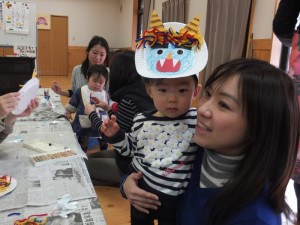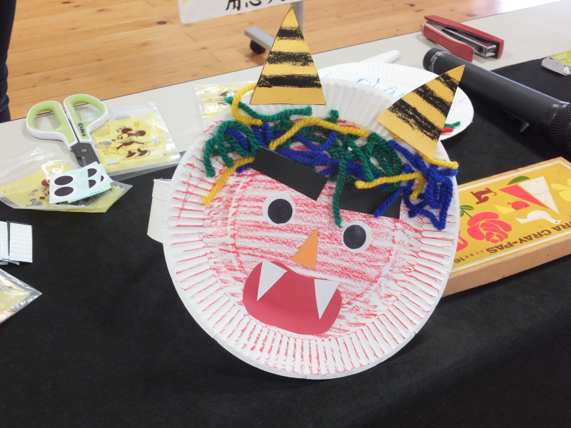30分ほどで完成、怖くて?可愛い鬼のお面をかぶって、幼児はニコニコ顔でした。