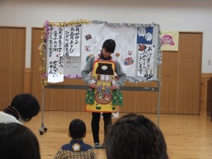 咸宜社会福祉協議会 会長あいさつの後、エホントさんによる「かえるがぴよーん」読み聞かせ