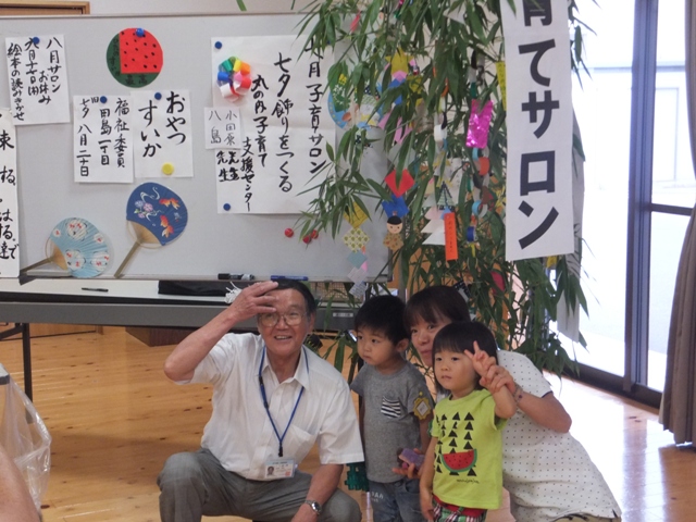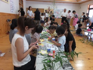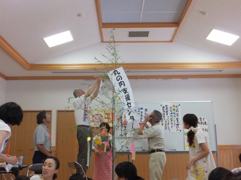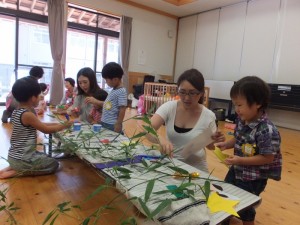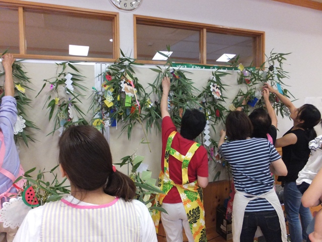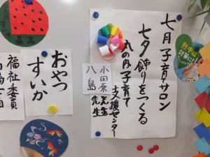 今回の子育てサロンは、「七夕飾り」作り。1週間遅れましたが、丸の内子育て支援センターの保育士さんの指導により、親子で笹に飾り付けや願い事を書いた短冊を飾りました。
