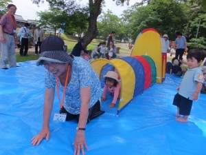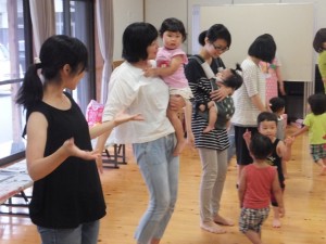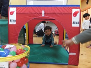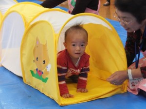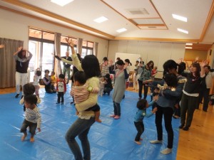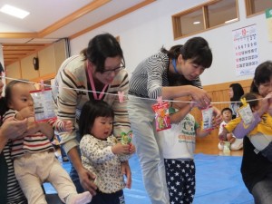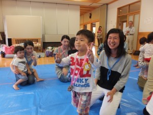 小さいお子さん、お母さん方44名が参加され、「サンサン体操」の後「トンネルくぐり」「アンパンマンDEゴー」「お菓子取り」「親子でじゃんけん列車」など楽しく遊びました。