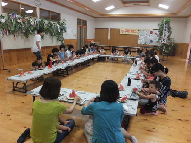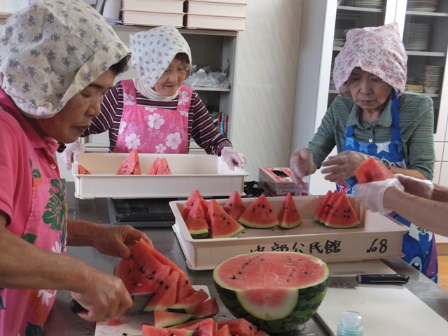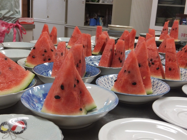 今日のおやつは「日田すいか」民生委員さん、福祉委員さんがお世話します。