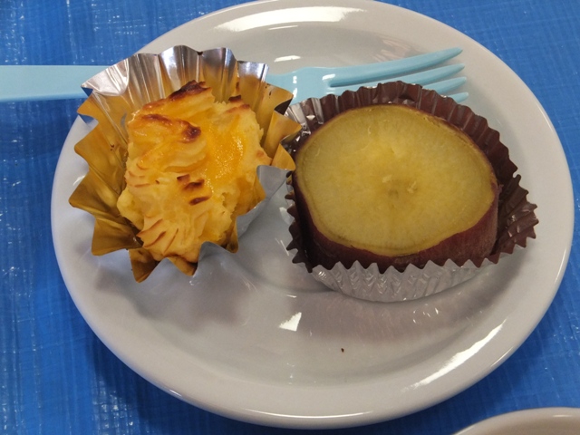 おやつは「スイートポテト」「ふかしイモ」「みかん」で、絵本の読み聞かせをしながら、皆で美味しく頂きました。