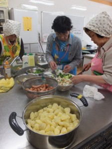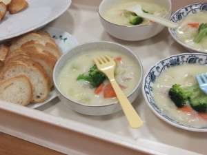「お麩」のラスクと「いちごミルクムース」、どちらも簡単で優しい味でした。最後は参加者全員で会食しました。