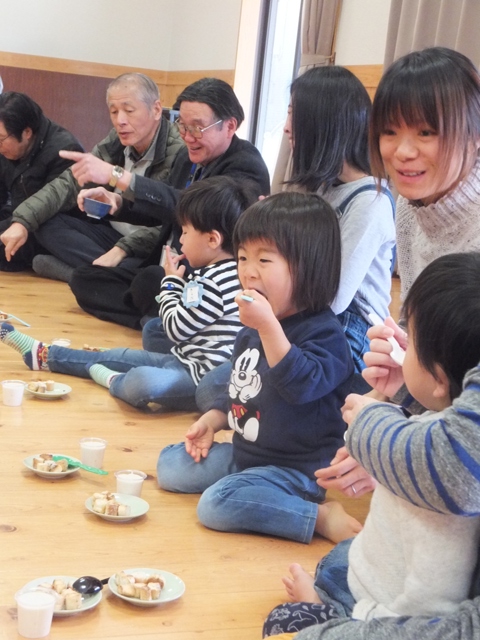 田島2丁目の「ひかり保育園」から男性の保育士を含めた3名が、エプロンシアター「ネズミの相撲」パネルシアター「大きなかぶ」「ゆき」をエレクトーン演奏をバックに楽しく歌って過ごしました。最後に民生委員、福祉委員の手作りおやつ「ぜんざい」やみかんを皆さんでいただきました。