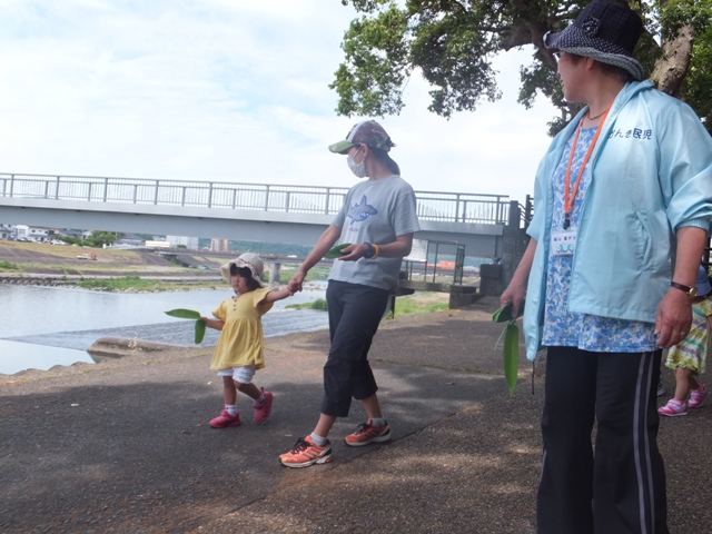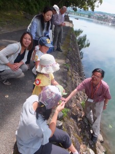 たくさんのお子さんとお母さんが参加し、三隈川散策、笹舟流しをしたり、「おたまじゃくし体操」「じゃんけんゲーム」を楽しみました。