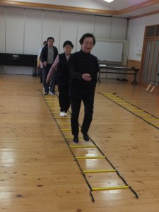 手足や頭の体操、姿勢を正しくする、ラダーを使ったウォーキングなど1時間程度の運動で、会員の皆さんいい汗をかいています。