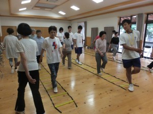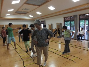 初回は、ゲーム感覚で脳と体を連携させる訓練や、肩甲骨体操、姿勢を正しくして歩く練習、ラダーを使ったステップ運動などを行いました。