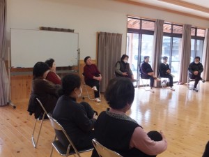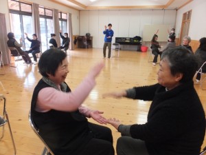 二人ペアになってわらべうた「お正月のもちつき」(トーン、トーン、トッテッタ、おっこねて、おっこねて・・・)のリズムにあわせた手遊びをしたり、椅子に座ってテレビを見ながらできる腰のストレッチをしました。