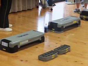 それぞれの心拍数や体力にあわせて台の高さを調整します。音楽に合わせて5分間ステップを踏んだら休憩、水分補給。