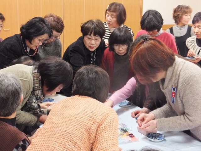 講師は諌元正枝さん。作業の指導をするには受講生の人数が多いので、諌元さんが8名の補助スタッフの方を連れて来てくださいました。