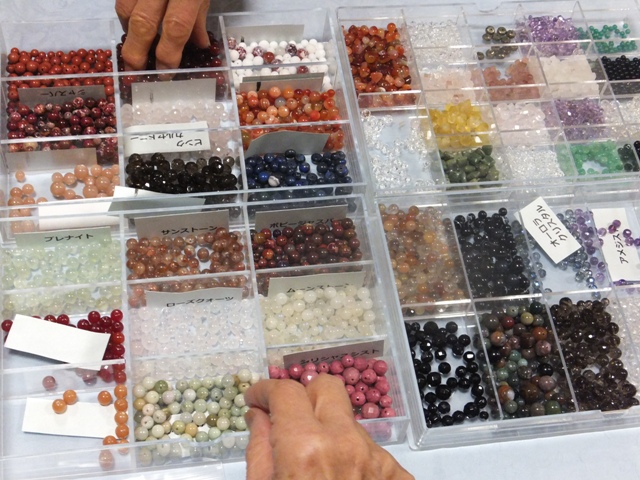 講師が準備した、材料のキラキラ光るストーンに、女子のテンションはあがります。種類がいろいろあって目移りしますが、